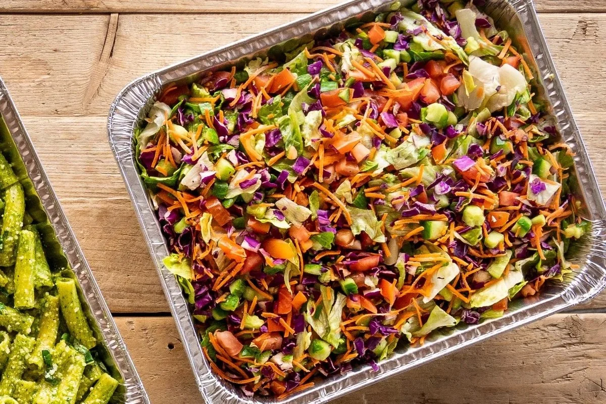 Freshly chopped lettuce, salad vegetables, cucumbers, and tomatoes