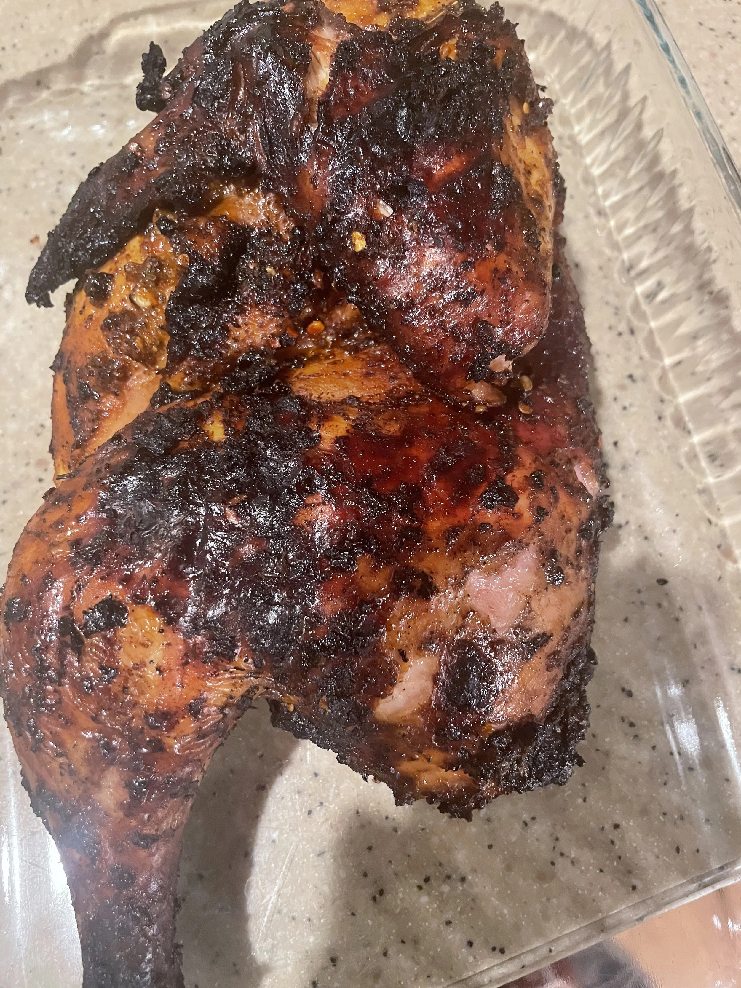 Bone-in chicken, dry rubbed with Jamaican jerk herbs & spices, marinated and finished on a charcoal grill